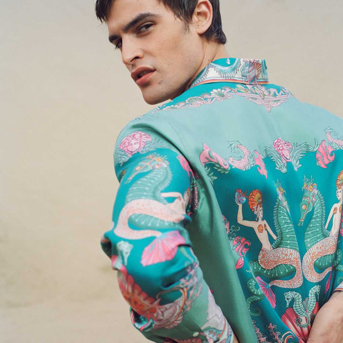 For men, coordinated sets and silk shirts meet printed sarongs and matching windbreakers. Tailoring embraces new softness through cotton‑wool blends, sheer nylon and zipped vests finished with the Medusa ’95. The attitude remains unmistakably statuesque, while the construction feels clean, modern and relaxed.